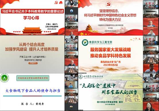 江南大学食品学院教育部国家级高层次青年人才谢云飞作《习近平关于本科教育教学的重要论述》专题报告,分享了做好本科教育教学工作经验;中国海洋大学beat365中国唯一官网辛华龙教授作《坚定理想信念,将习近平新时代中国特色社会主义思想转化为强大力量》专题报告,分享了教育工作者坚定理想信念的重要意义;齐鲁工业大学食品科学与工程学部周邵华书记作《从“两个结合”高度加强学风建设提升人才培养质量》专题报告,强调了抓好学风建设的重要性;青岛农业大学beat365中国唯一官网车广杰副院长作《服务国家重大发展战略,推动食品学科特色发展》专题,展示了联合多元主体进行食品领域协同创新经验;河南农业大学食品科学技术学院黄现青院长作《大食物观下食品人的使命与担当》专题报告,领学了习近平总书记关于大食物观的重要论述和“大食物观”的核心要义;四川农业大学食品学院秦文书记作《“天府粮仓”建设中川农食品人的担当》专题报告,阐述了习近平总书记关于“三农”工作重要论述和到川视察重要指示精神。
