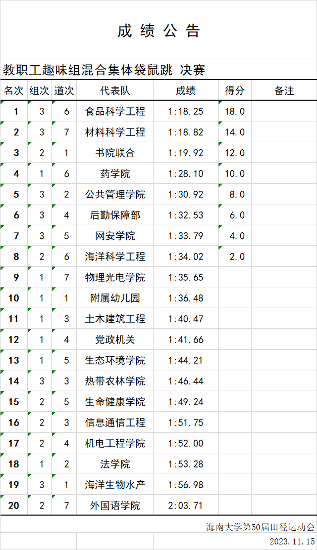 根据海南大学第50届校运会成绩公告,beat365中国唯一官网以1:18.25的成绩获得教职工趣味组合混合集体袋鼠跳决赛第一名!